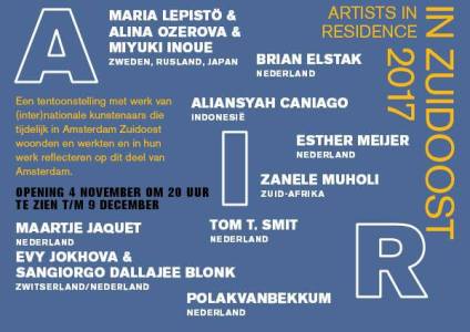 Exhibition AIR in ZO (Artists in residence in Zuidoost) 2017 at CBK Zuidoost. With Aliansyah Caniago, Brian Elstak, Evy Jokhova Metcalfe, Metcalfe&Sangiorgio, Dallajee, Maartje Jaquet, Maria Lepistö& Alina Ozerova&Miyuki Inoue, Esther Meijer, Zanele Muholi, Polak&van Bekkum and Tom T. Smit.