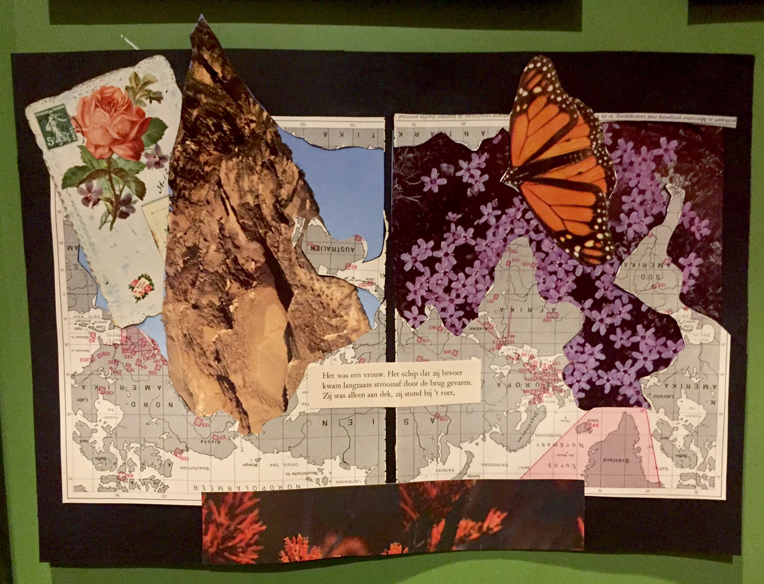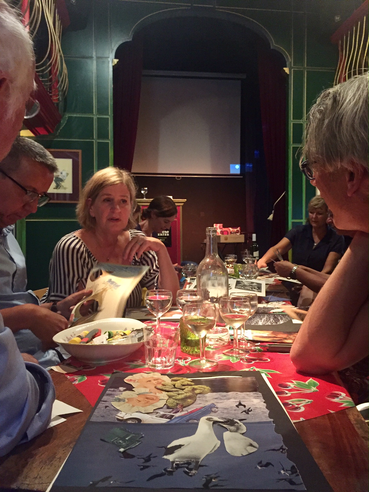 Last Thursday I gave a collage workshop in the small and beautiful Torpedo Theater in Amsterdam, to teachers of the Hotel School (ROC of Amsterdam), as a farewell party for their fellow French teacher who was going to retire. For this special occasion I had brought very old French magazines (1920s, – 1960s) and beautiful old books about traveling, nature etc.
