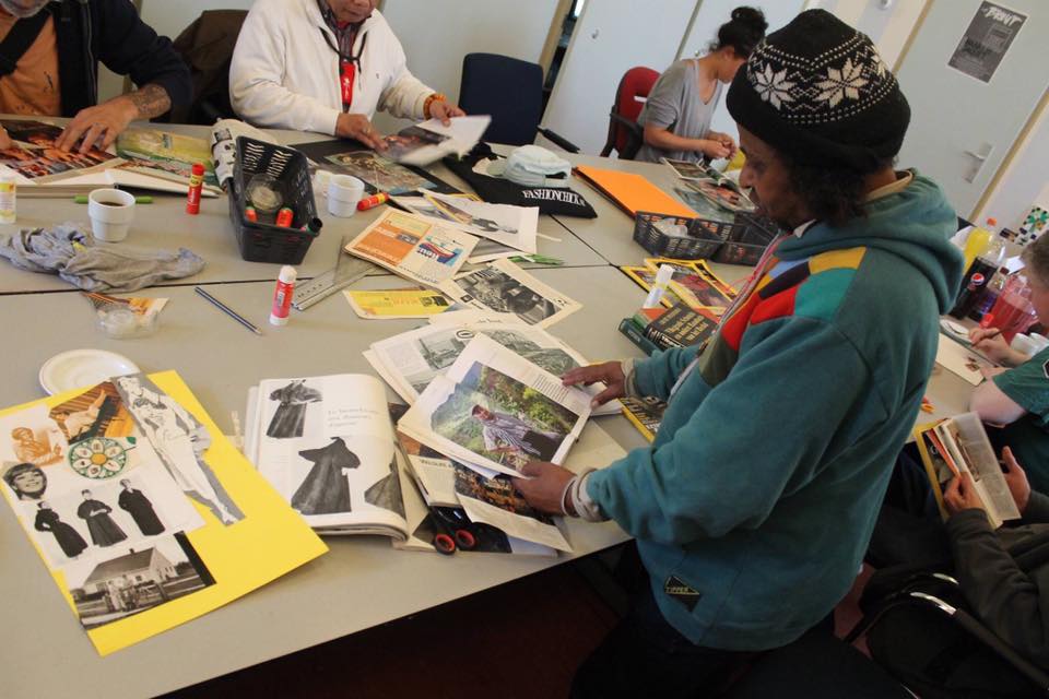 Participants working with the materials, creating their collages, at a previous collage workshop.