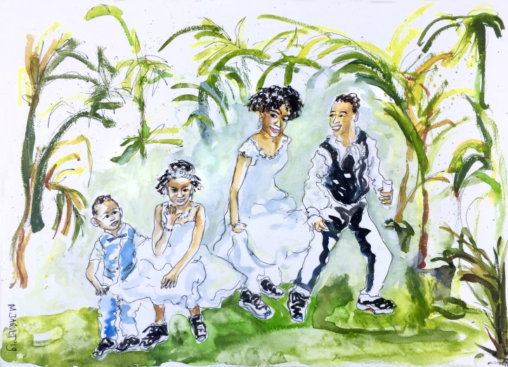 The wedding ceremony took place in the botanical garden of Paramaribo (Surinam); in the evening the family wore black Nike Jordan’s sneakers at the party. The painting is a combination of both scenes, the family is dancing together in between the palm leaves.