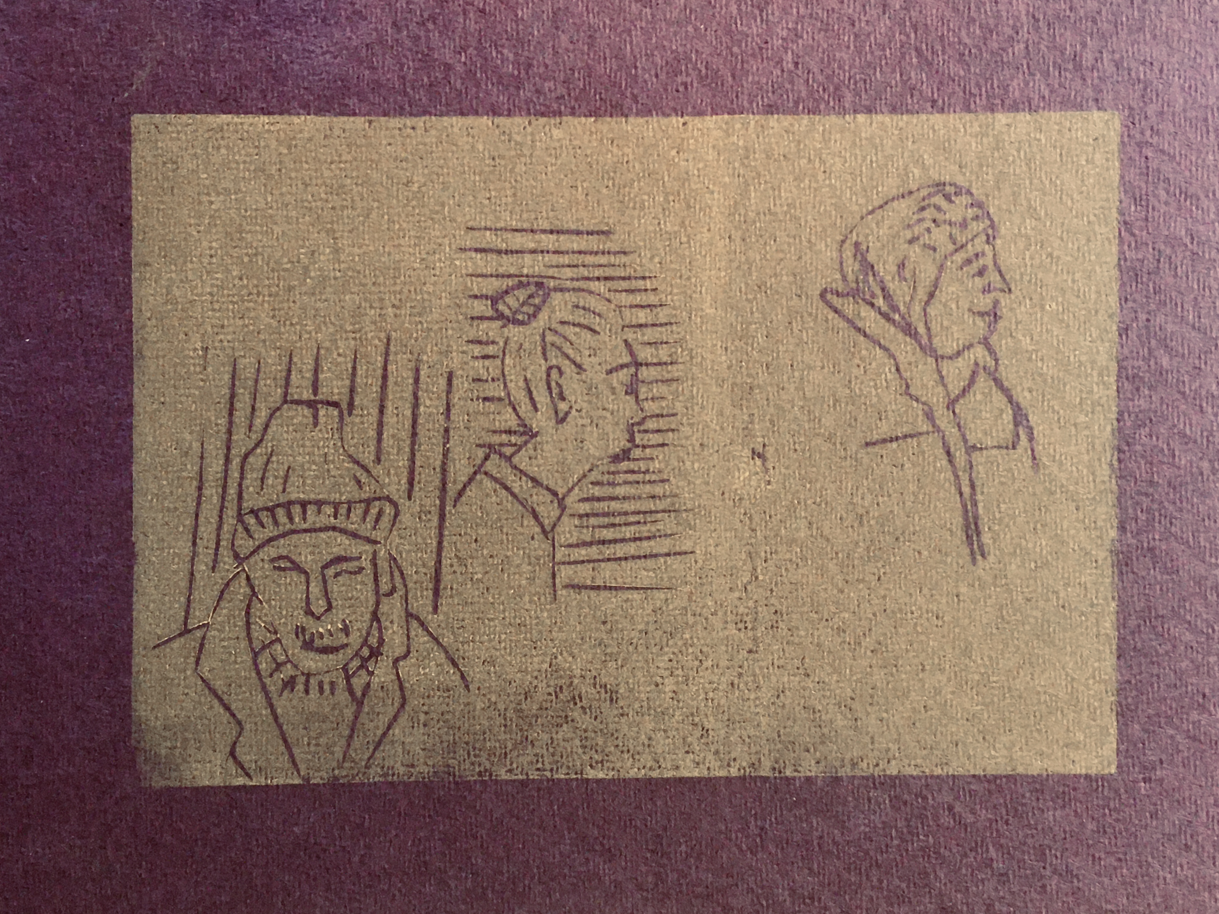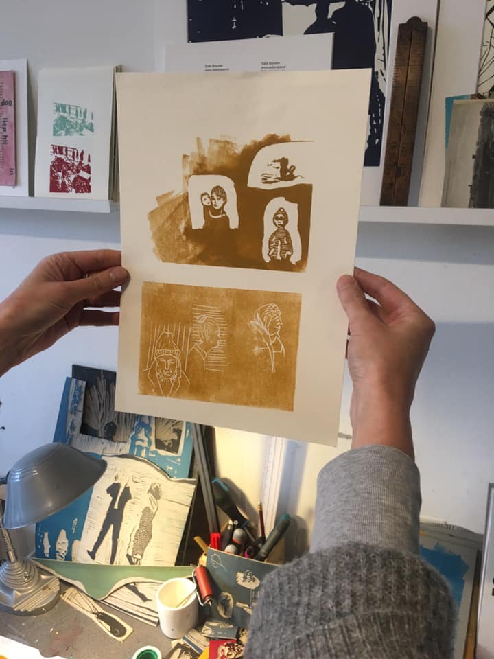 Spent a great afternoon today with Edith Brouwer. We each made three linocuts for her five-hundred-slides-project, I also made some prints for myself. It was great to play with different colors of ink and types of paper.
