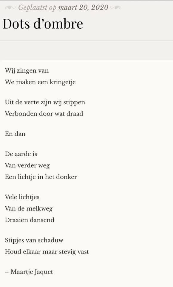 Poëziecentrum Nederland is building a collection of Dutch poetry about this time in which we are dealing with the pandemic Covid -19, in collaboration with the Province of Gelderland and ‘Dichter des Vaderlands’ Tsead Bruinja. My poem dots d’ombre, inspired by Marian Bijlenga’s art has been added to this collection. As I don’t trust Google Translate, for those who have difficulty with the Dutch language, I translated the poem into English (below). Enjoy and stay well.