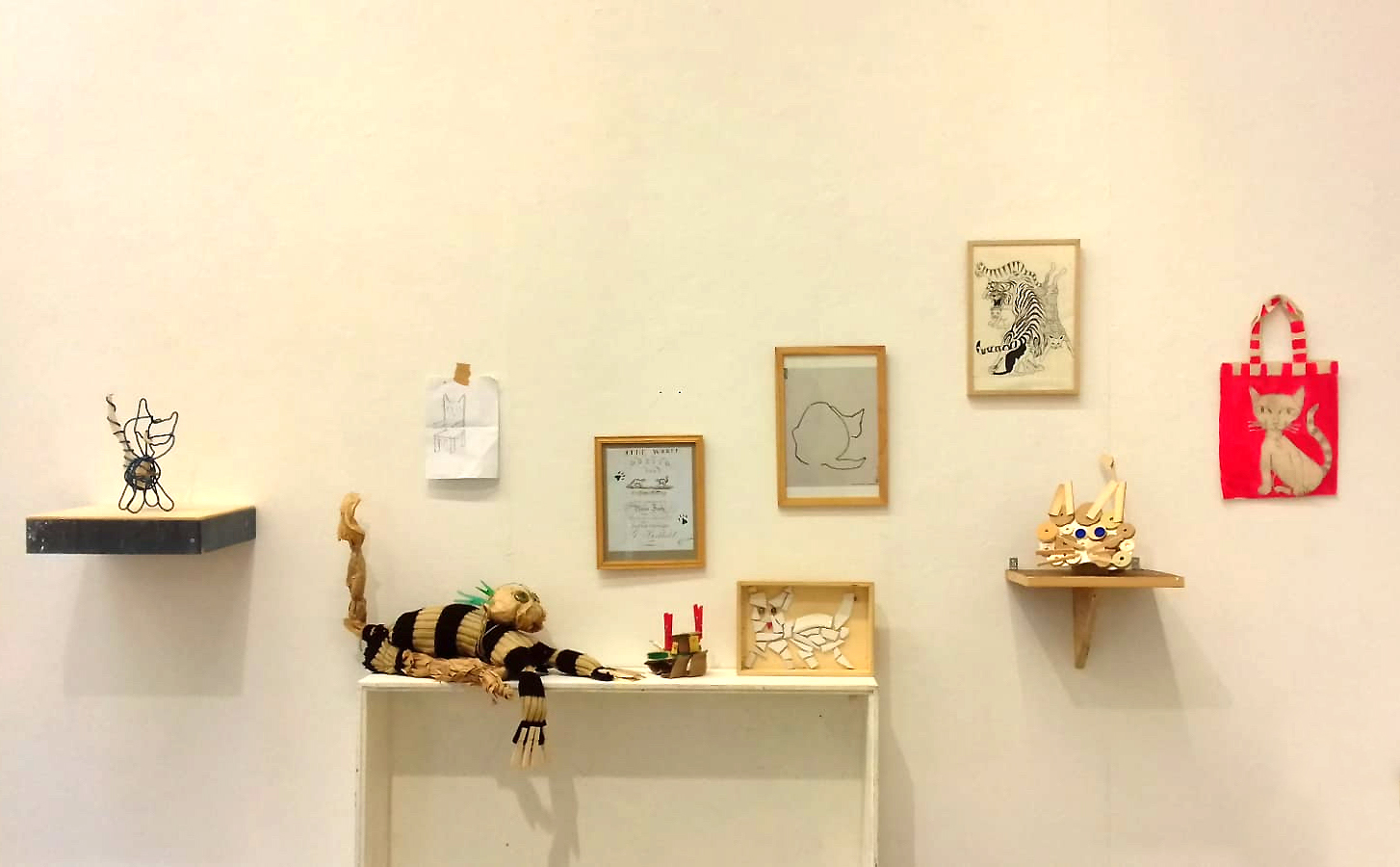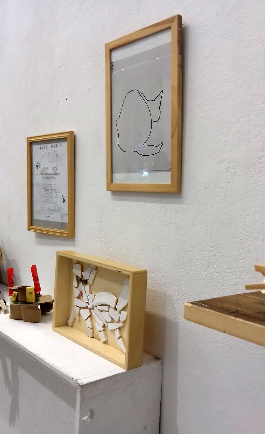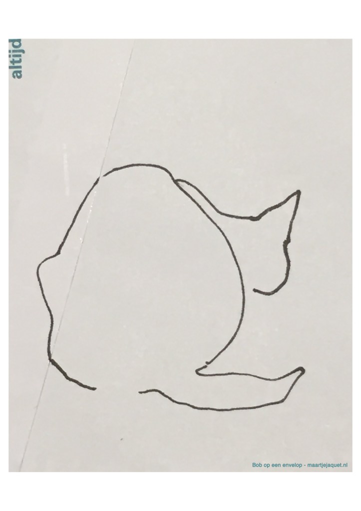 This Bob drawing (a professional print of it, size 20x30cm) would have been hung in De Hallen Amsterdam, where one now can admire a beautiful collage triptych by the artists who also made the exhibition Kattenstad (‘Cat city’) in art gallery WG Kunst: Femke van Heerikhuizen, Ge Wasco, René Windig and Luitzen Zandbergen. Now this Bob is on show in the exhibition Kattenstad itself! Bob secretly thinks that this is pretty cool …