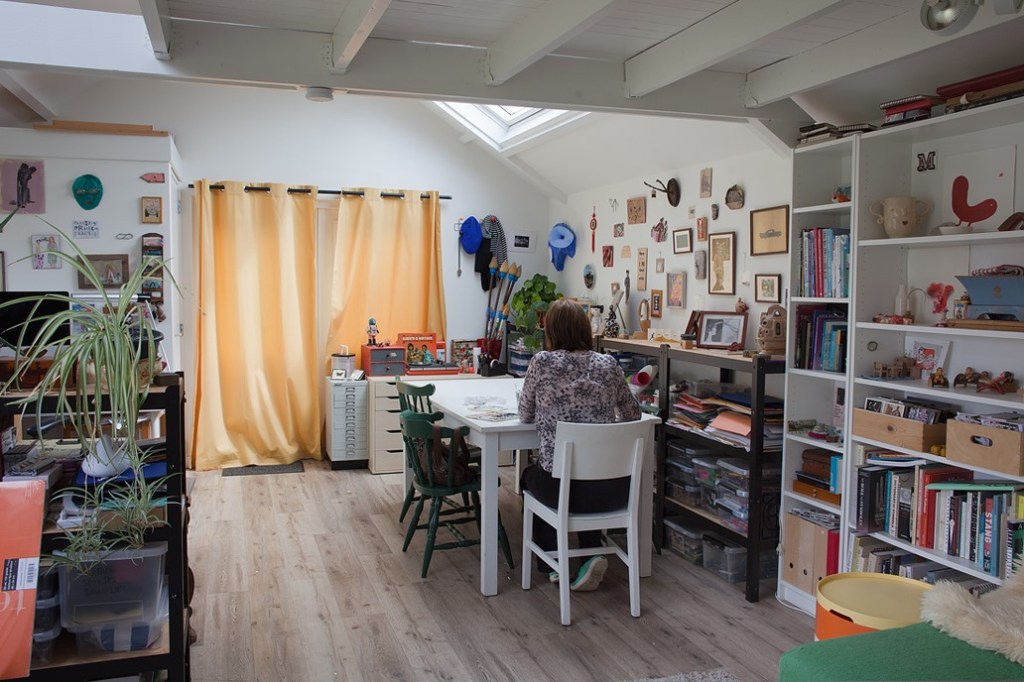 The photo is part of Andrés ongoing project: Artist In The World – Never Ending Art Trip. In his photos, one can see the artist in his / her studio, photographed from the back.