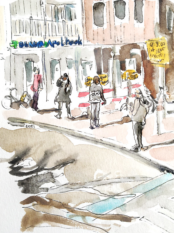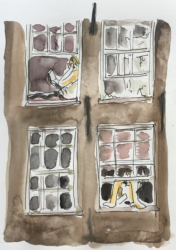 The test results were called to me on Friday, March 13th. I was infected with the coronavirus, one of the first people in the city of Amsterdam. Despite my illness, I made drawings of the situation in the city, the first one of the neighbors across the street who were enjoying the sun in their windows.