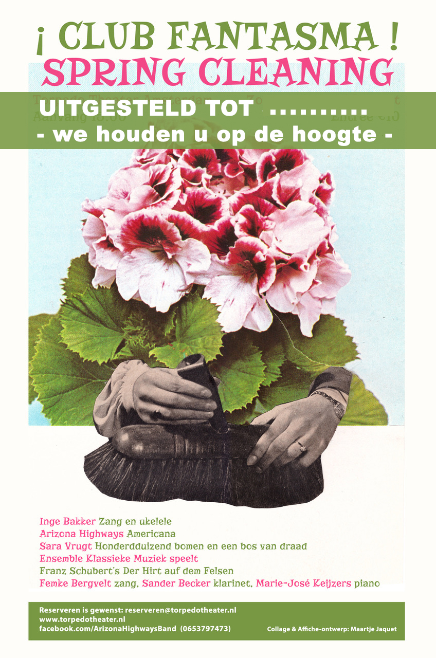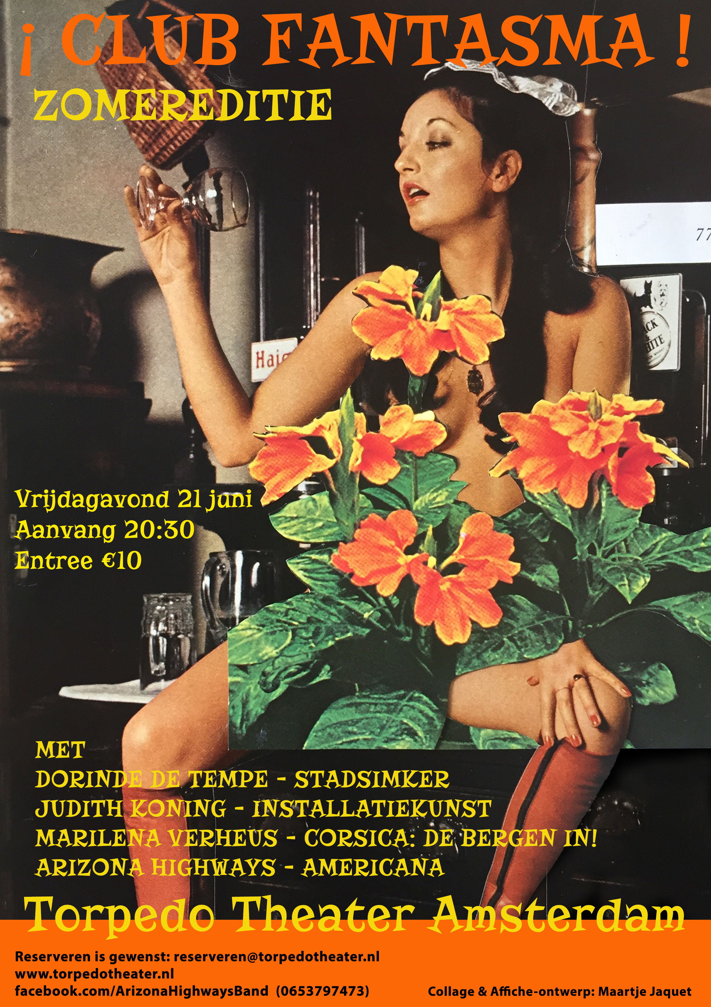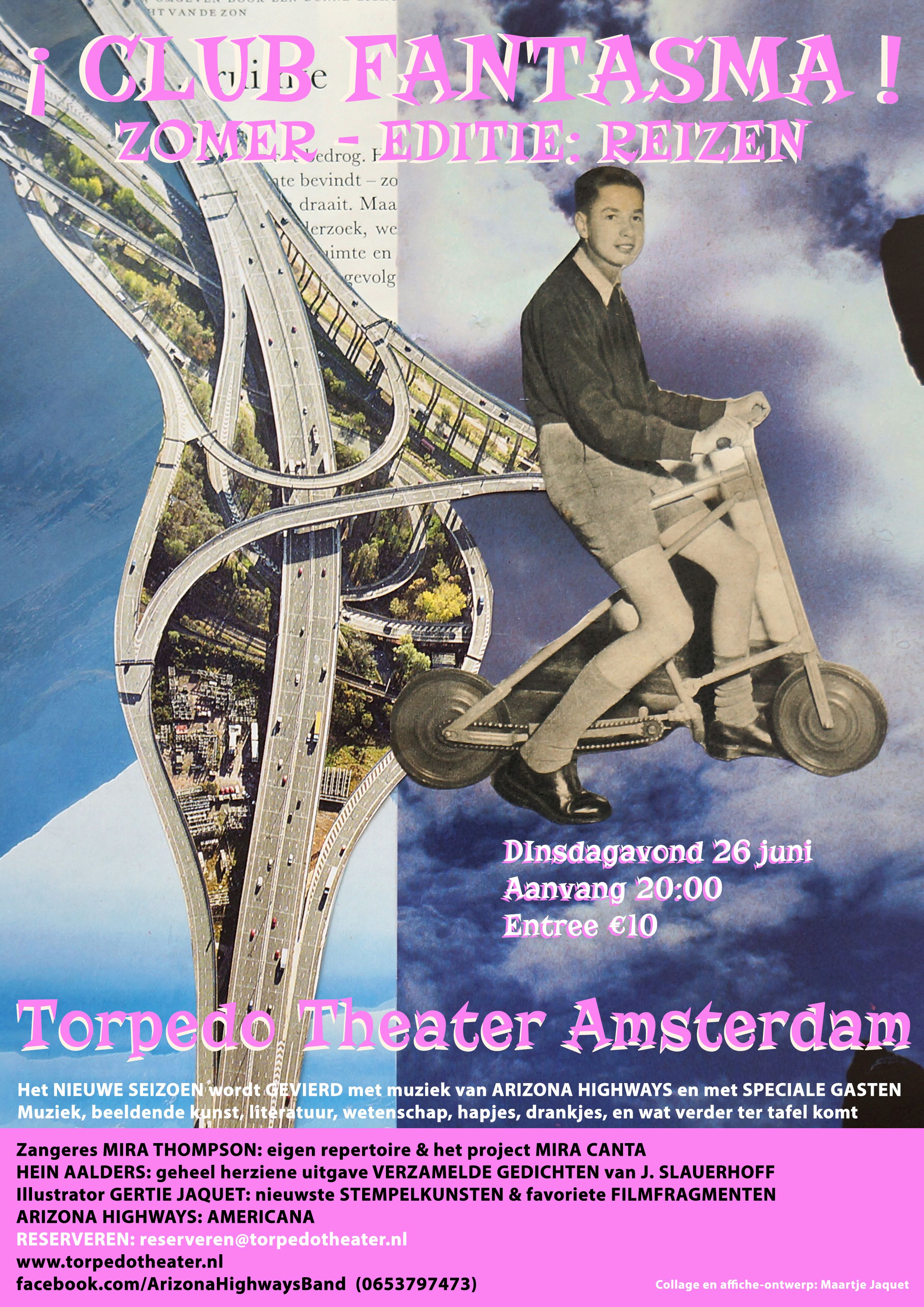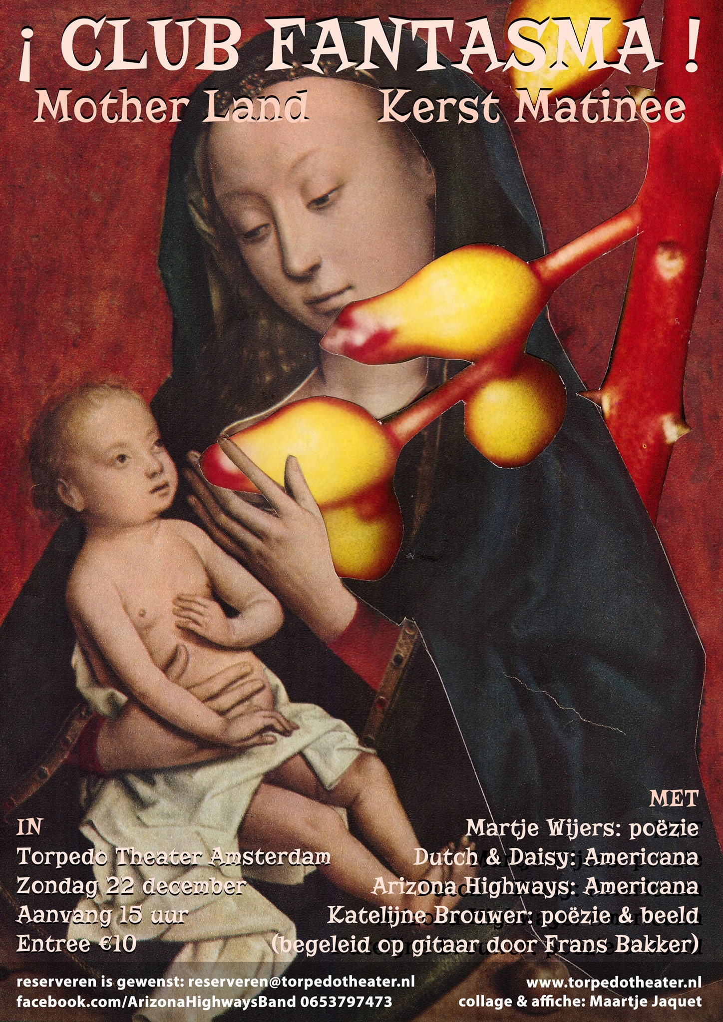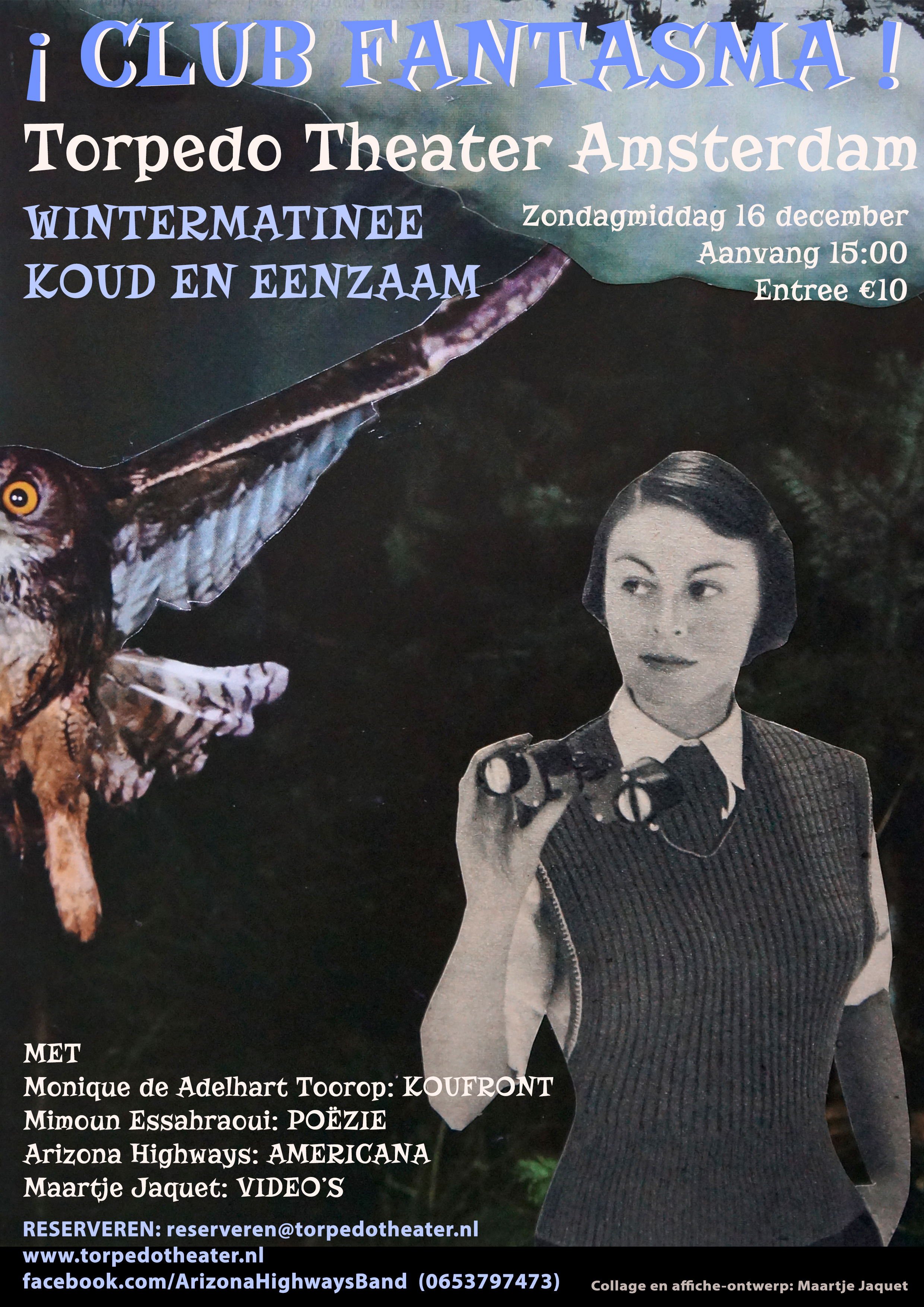 Hardly ever do I mention on my website that besides my work as a visual artist / art teacher I sing in a band, Arizona Highways. Every beginning of a new season we perform in the smallest, cosiest and most beautiful theater in Amsterdam: Torpedo Theater, inviting musicians, writers, visual artist, scientists, you name it, according to a certain theme, such as Cold and Lonely (winter 2018), Travelling (summer 2018), Mother Land (Christmas 2019). These special evenings are called ¡CLUB FANTASMA!. All posters for ¡CLUB FANTASMA! are made by me (collages & design).