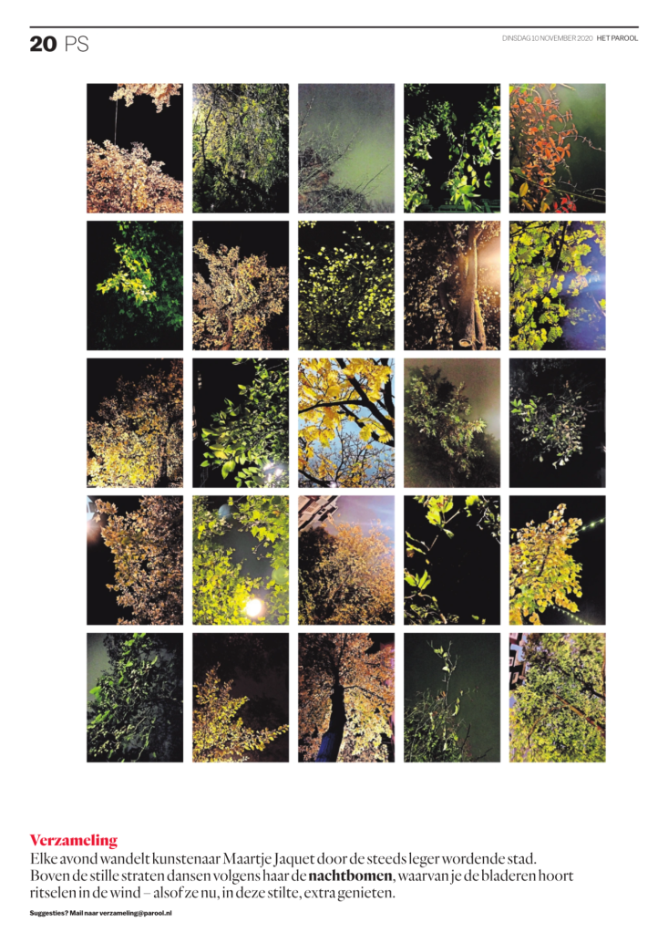 Today in Het Parool, the Amsterdam based Dutch national newspaper, my photo series Nachtbomen (Night Trees), taken during my nightly walks through the streets of our city during the second lockdown due to increasing numbers of people that are infected by Covid-19. Some joy in these sad times. If you like to enjoy all Night Trees separately and on a bigger scale, you are welcome to have a look at my online photo album.