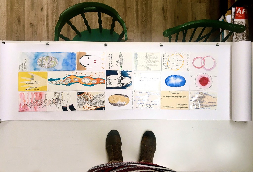 My hand My feet My land – ink, (japanese) watercolor and cellophane on 19x13cm paper, mounted on a paper roll. Width 165 cm, height 52.5 cm. Photographed as prepared for the exhibition in my studio in Den Ilp. Next week, when the exhibition has been opened, I will be posting some new photos.