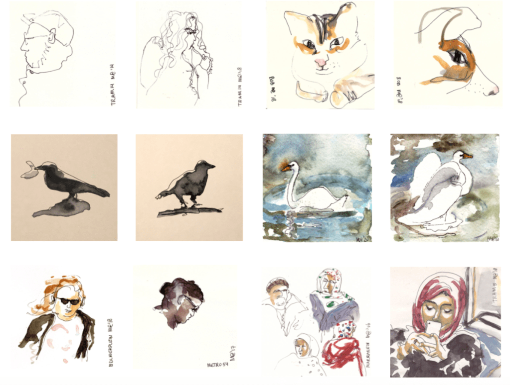 My new contributions consist of pen drawings and works in pen and water color on different kinds of paper and varying prices. They fit perfectly in a 10x10cm photo frame, if you like.