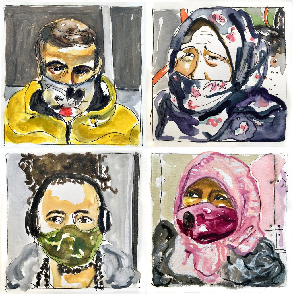We believe that this group of watercolors meets our wishes. The artist has made a personal testimony to the current crisis. She didn’t choose, like so many others, to make photos of empty streets, but for portraits of real people whose daily lives, like all of ours, have been affected by the crisis and the measures taken by the government.