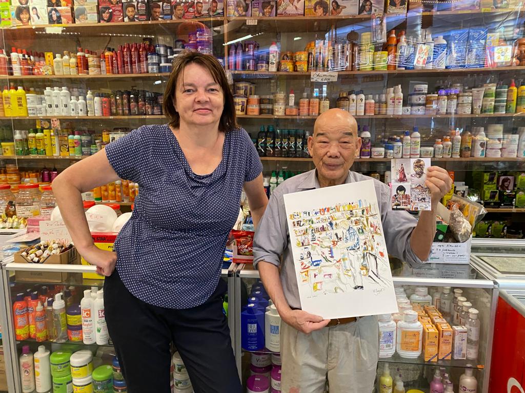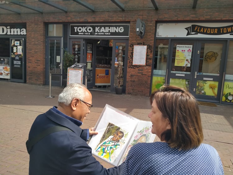 Yesterday morning I brought a print of my drawing to Toko Omoe (aka Toko Kaihing) in Amsterdam Zuidoost. Toko Omoe is the most beautiful store with EVERYTHING in the field of good food, hair care, Buddha statues and the most delicious sandwiches, fried rice, etc. The toko is named after Omoe (or official spelling ‘omu’ which means ‘uncle’ in Sranan Tongo). Omoe himself is in the drawing. And in the photo with me. On the website of Toko Omoe there is a nice article about our exchange and about my work!