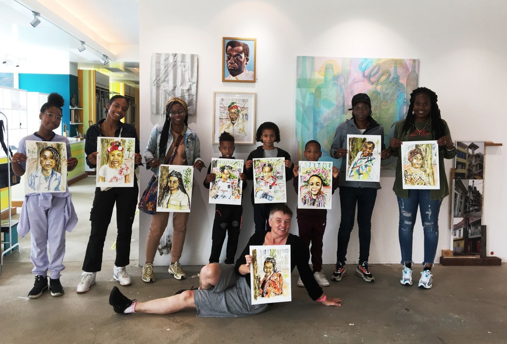 On the photo, standing, from left to right: Riquensha, Kyara, Gracia, Keanu, Tasharo, Dynevion, Glenda, Rowena. Lying down: myself, holding the portrait of Esmeralda., who was the only person who couldn’t attend. Behind us, on the wall, my portrait of Hillary and artworks by Delano Mc Andrew, David KC Moir, Tamar Rozenblat and Su Tomesen. Photo taken by Lucy Hooft.