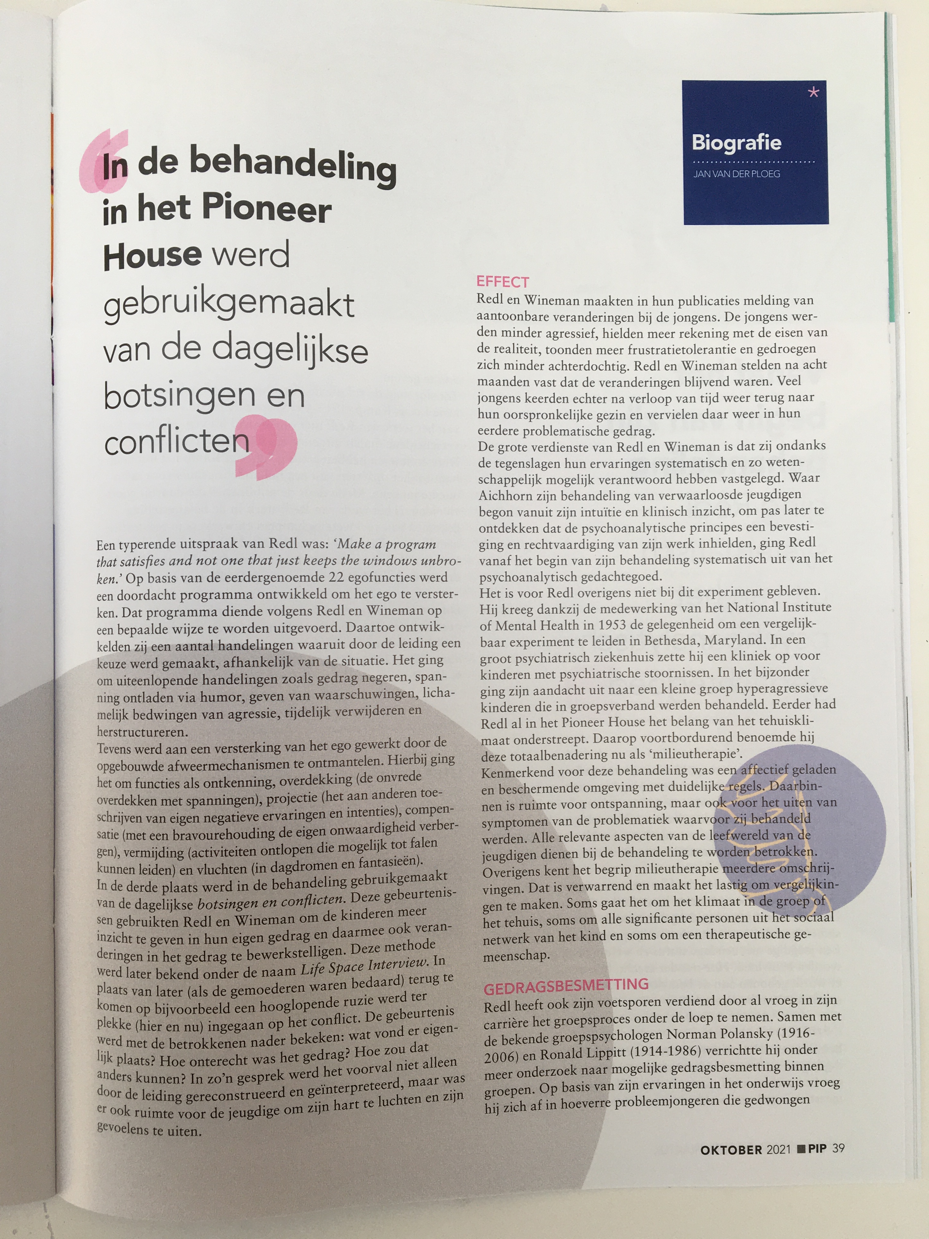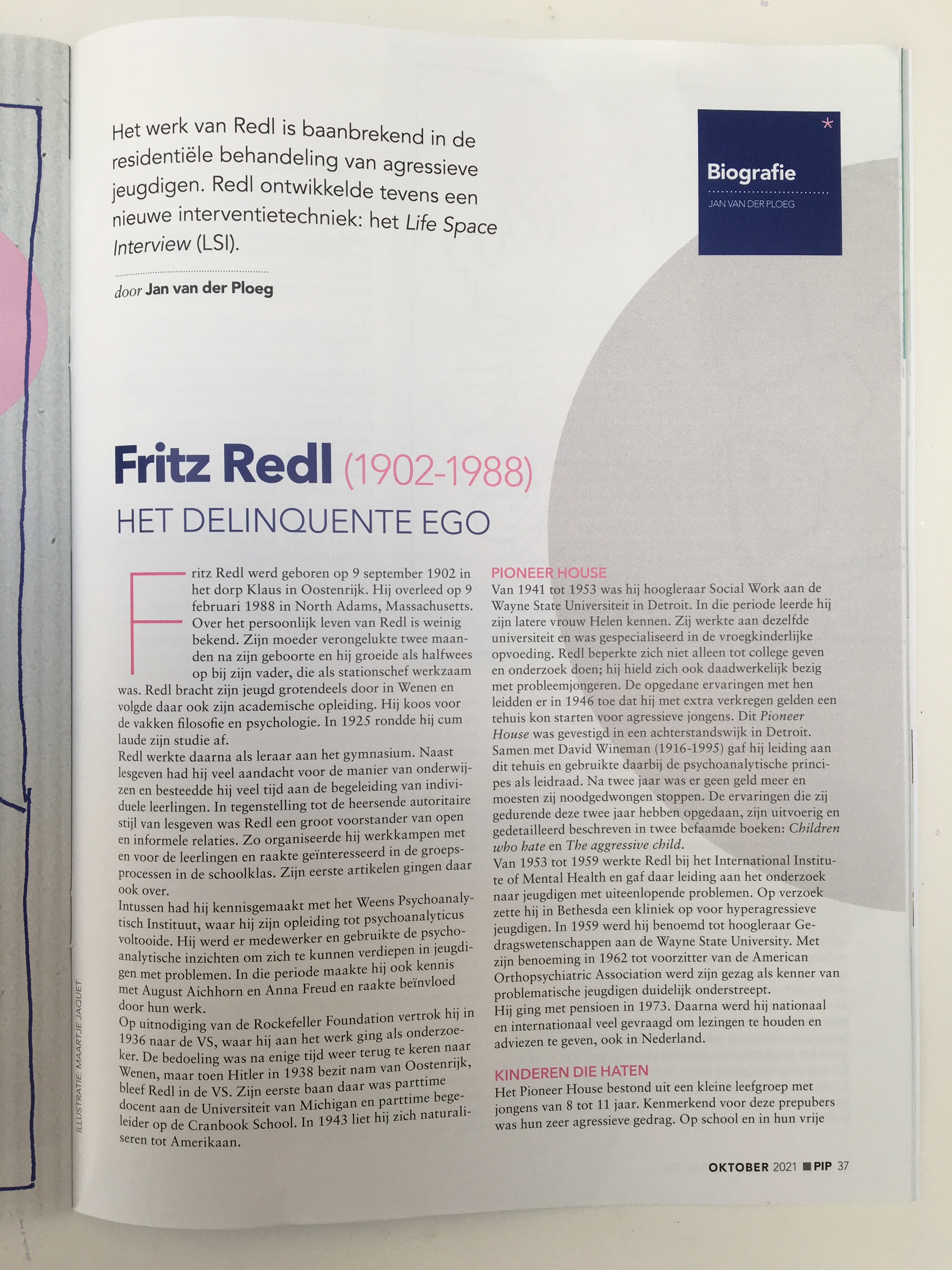 In issue 123 of PIP, there’s another biography from Jan van der Ploeg’s recent book, Pioniers in de jeugdzorg, dertig denkers en doeners. This time it’s about Fritz Redl, titled ‘Het delinquente ego’ (The delinquent ego).