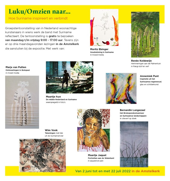 Coming up, June 2nd through July 22nd: Luku/Omzien naar… how Suriname inspires and connects, a group exhibition showing work by eight artists who have a special bond with Suriname: Moritz Ebinger, Maartje Jaquet, Renée Koldewijn, Bernardin Langezaal, Annemiek Punt, Maartje Punt, Marja van Putten and Wim Vonk.