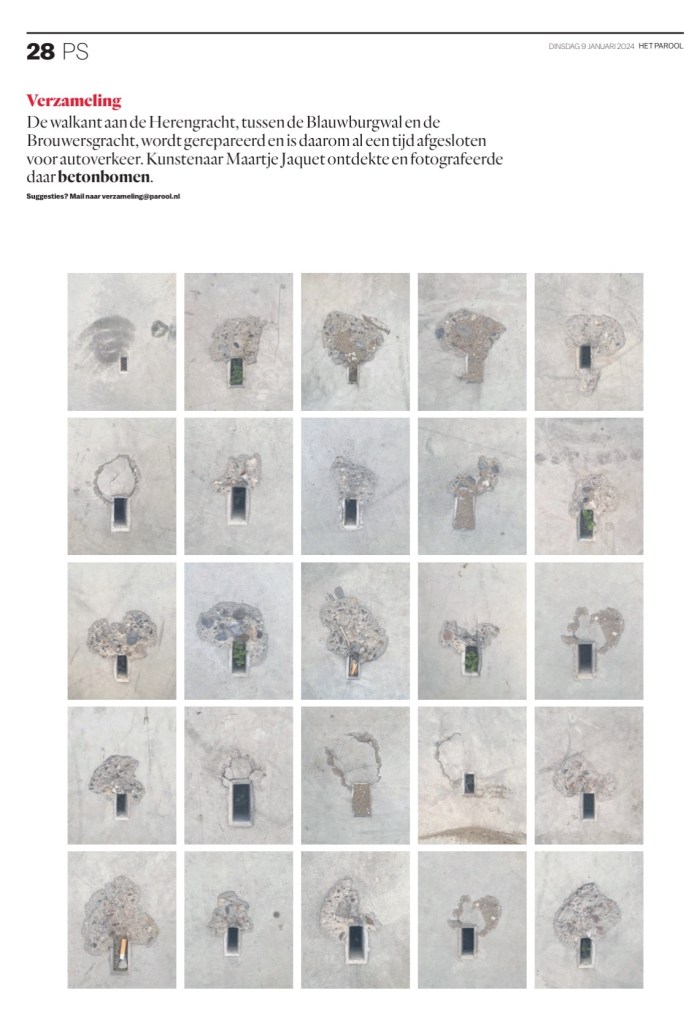 The quay side on the Herengracht, between the Blauwburgwal and the Brouwersgracht, is being repaired and has therefore been closed to car traffic for some time. Artist Maartje Jaquet discovered and photographed concrete trees there.