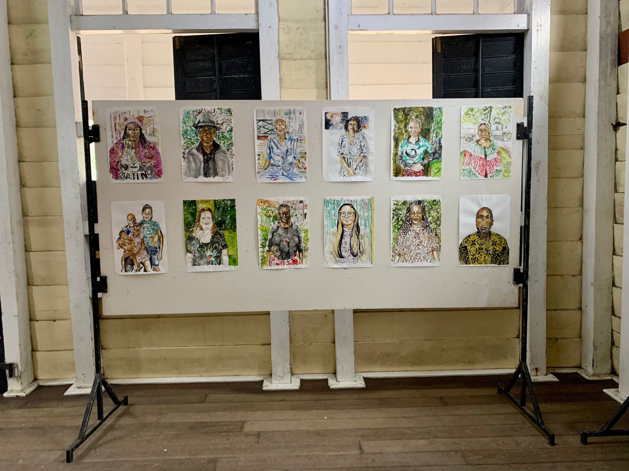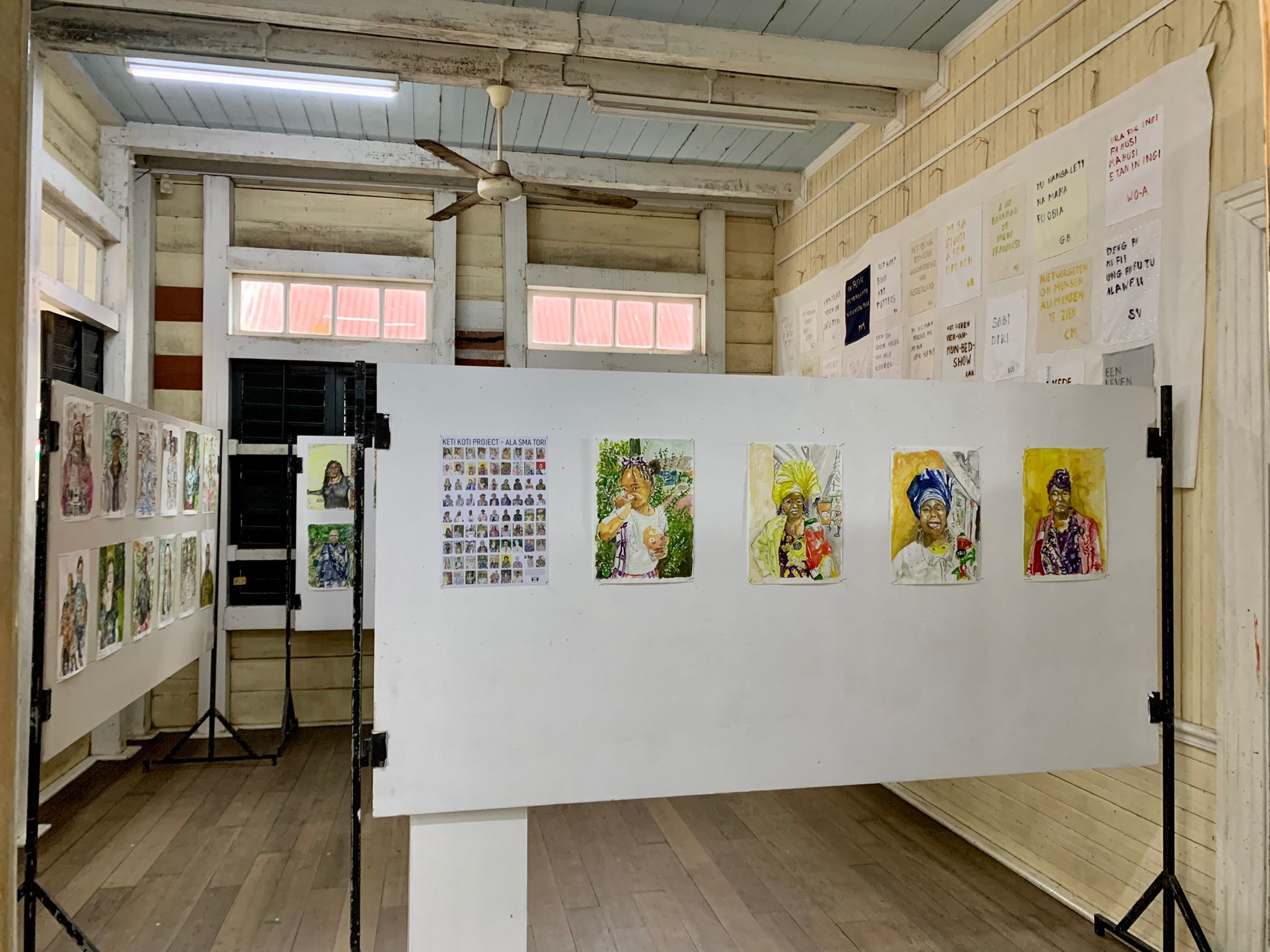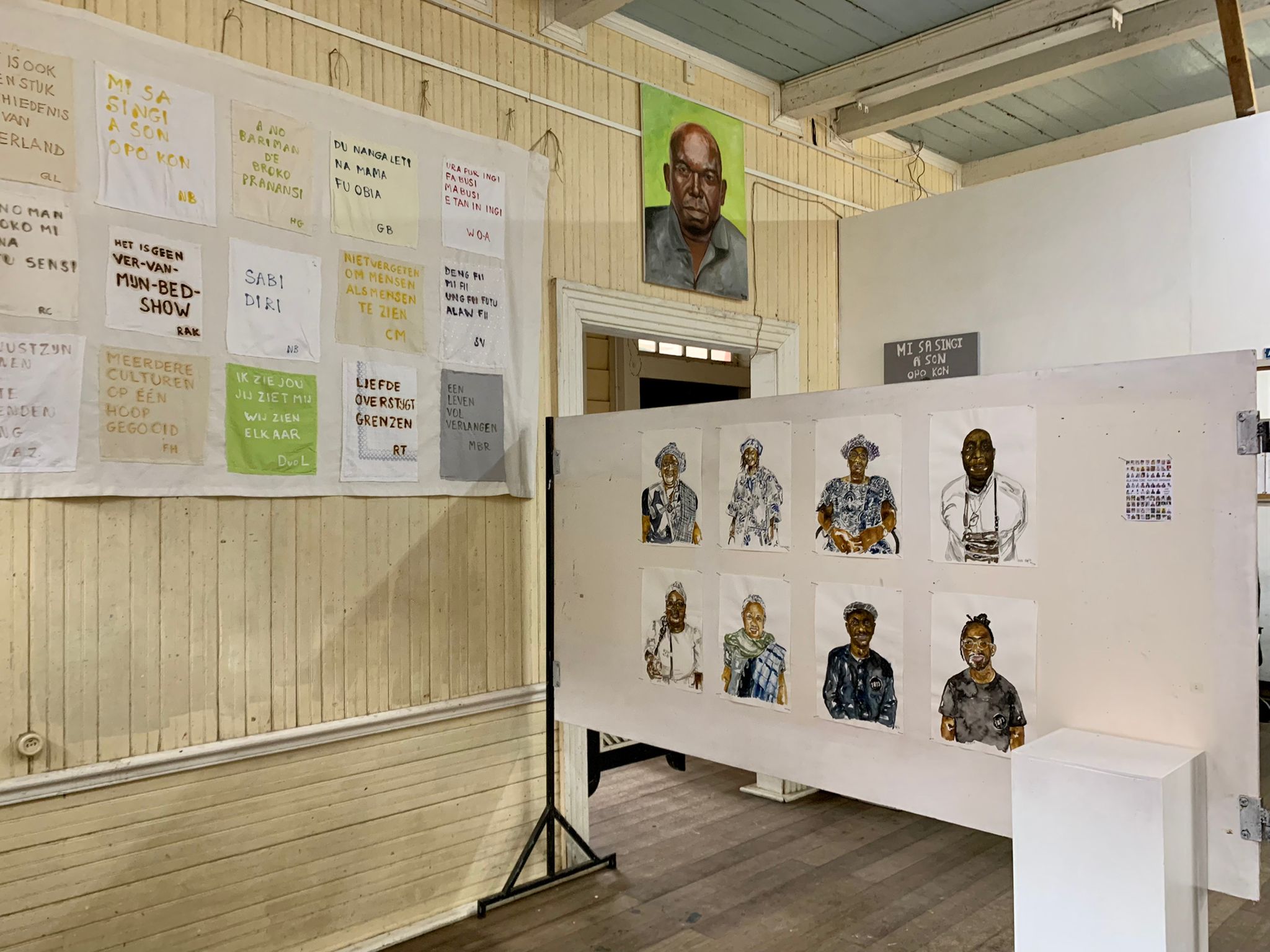 As of today the first big overview exhibition in Suriname, at the Nola Hatterman Art Academy in Paramaribo, is open for the public. A total of 36 original portraits – pen/pencil/watercolors on paper – can be seen here. Also, this exhibition features the first installation of the finished ‘mamyo’, a canvas textile art work with thirty quotes from the interviewees, about what Keti Koti, i.e. the abolishment og slavery by the Dutch in the Caribbeans, means to them. Each quote has been painted in different pieces of cotton, with personalized ink made by me, with meaningful materials.
