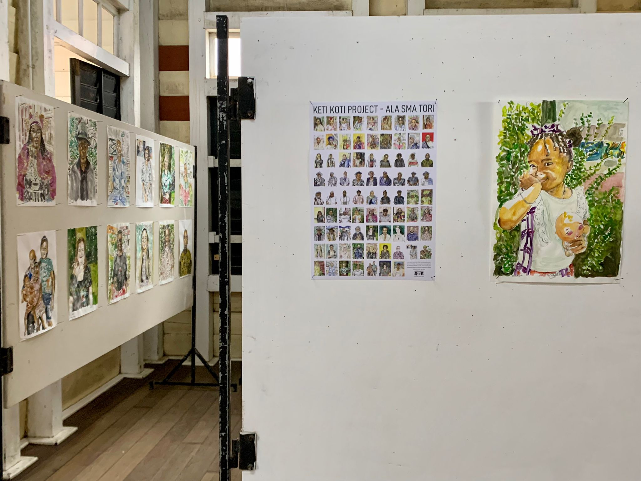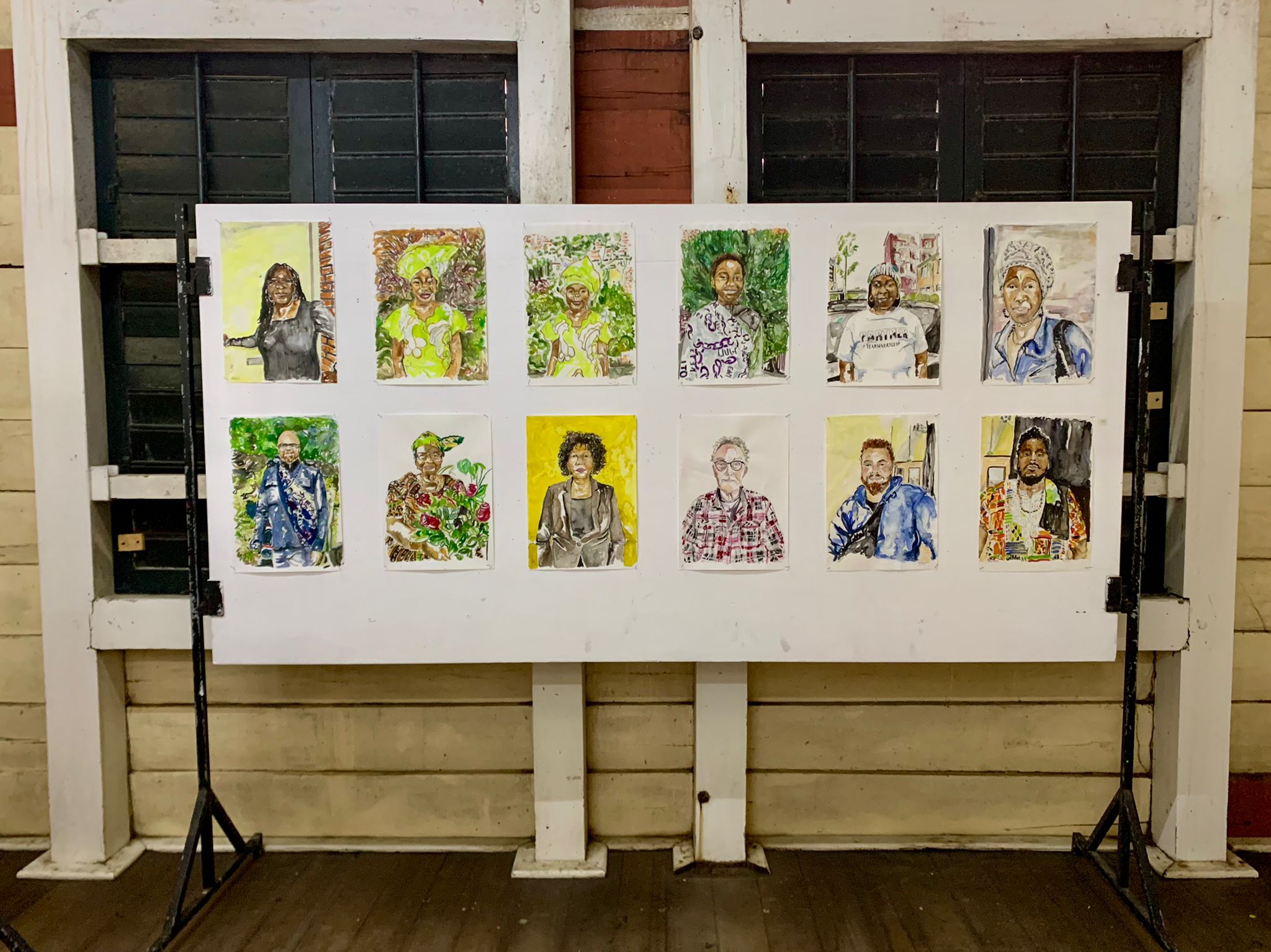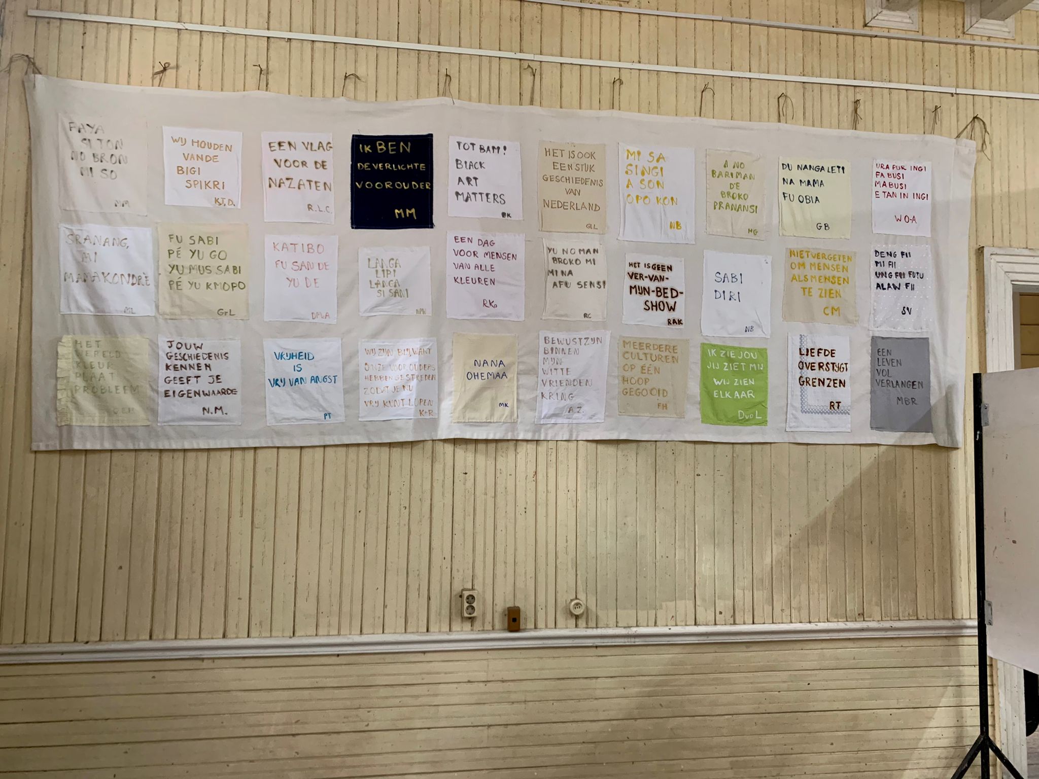 As of today the first big overview exhibition in Suriname, at the Nola Hatterman Art Academy in Paramaribo, is open for the public. A total of 36 original portraits – pen/pencil/watercolors on paper – can be seen here. Also, this exhibition features the first installation of the finished ‘mamyo’, a canvas textile art work with thirty quotes from the interviewees, about what Keti Koti, i.e. the abolishment og slavery by the Dutch in the Caribbeans, means to them. Each quote has been painted in different pieces of cotton, with personalized ink made by me, with meaningful materials.