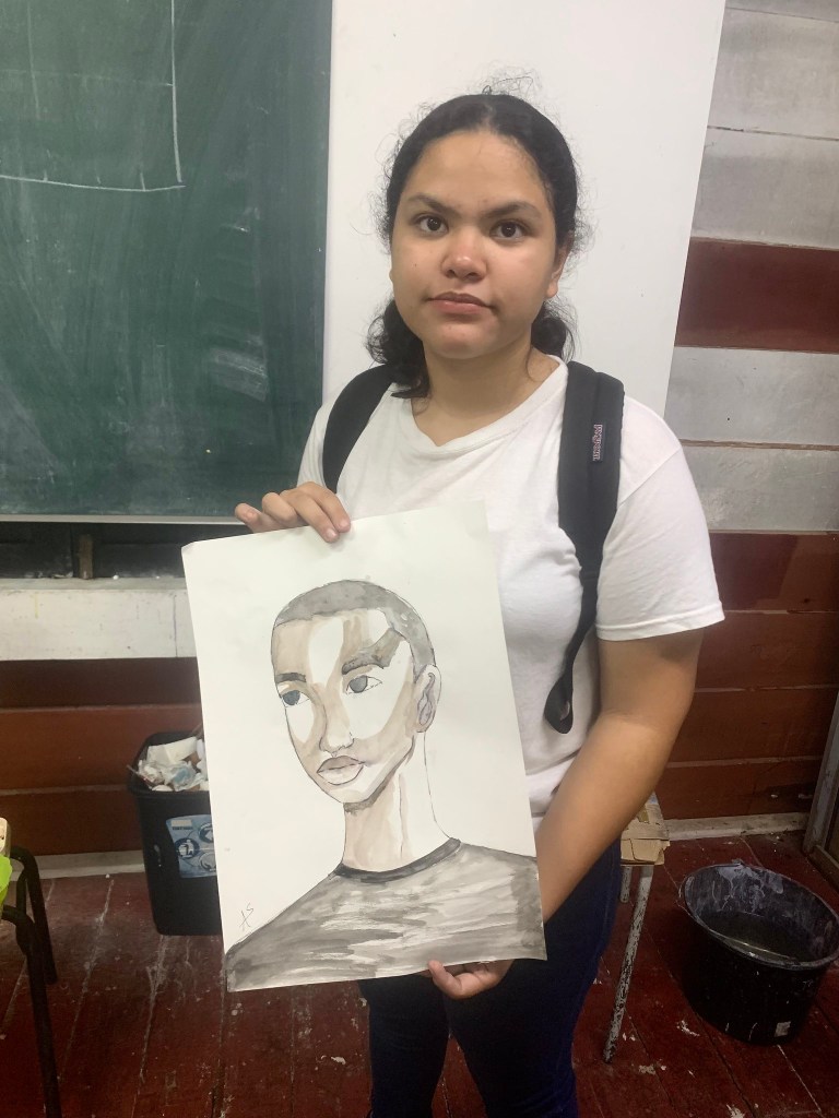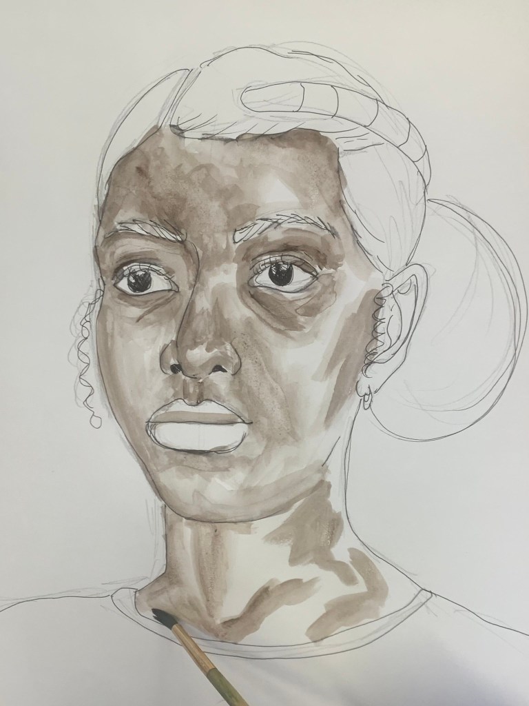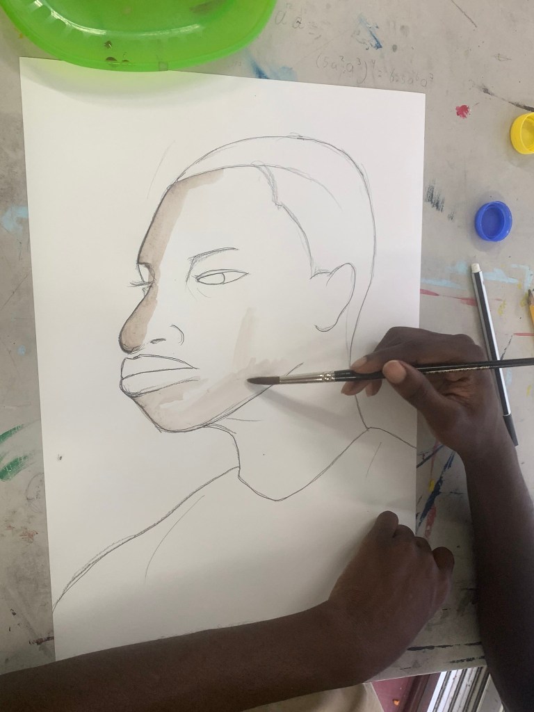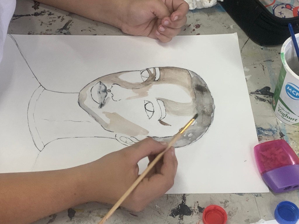 - explanation about watercolor paint, how to use the paint with the water, the importance of leaving light parts white (even with dark skin), therefore always start with the darkest parts. the students were only given two shades of brown to work with.