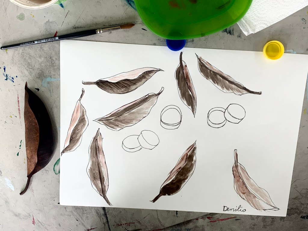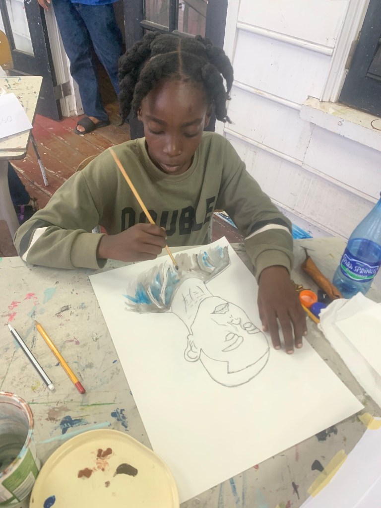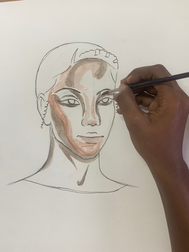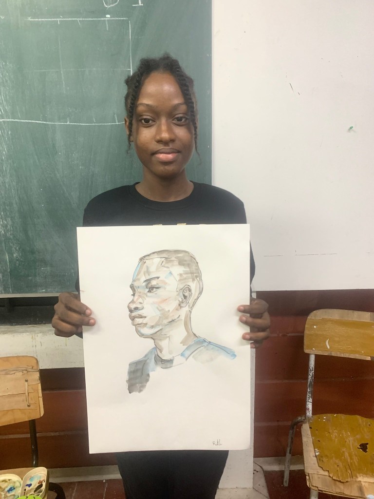 - explanation about watercolor paint, how to use the paint with the water, the importance of leaving light parts white (even with dark skin), therefore always start with the darkest parts. the students were only given two shades of brown to work with.