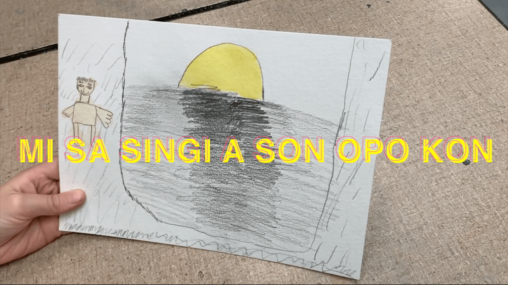 Noémi Beyer is a visual arts teacher at the Oscar Carre School, a primary school in Amsterdam. Her portrait is in my book ALA SMA TORI – Keti Koti Verbeeld, including an interview and her favorite poem, Orfeu negro by Michael Slory. Noémi had chosen the first line of it, ‘Mi sa singi a son opo kon’ (I will sing to make the sun come up), as the title for her story. I painted this text with ink made from turmeric on pieces of cotton. Since I had been working as a guest teacher in her classes (groep 5 = grade 3, 8/9 years old), I came up with this extra art assignment. using the same turmeric ink, and some of the coffee ink I had used for Max Linsen’s story (whose portrait and story are also in my book).