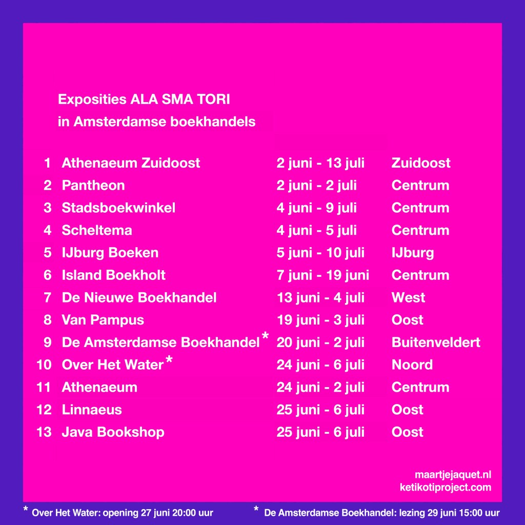 Here’s an overview of all exhibitions around my book ALA SMA TORI – Keti Koti Verbeeld , with the dates. With two extra events: an opening on Thursday, June 27th at 20:00 in Boekhandel Over het water, and, on Saturday June 29th, at 15:00, a lecture in De Amsterdamse Boekhandel. For the latter: call / email to make a reservation. There are still places available, but if there are 15 registrations or more, it will go ahead! Access: €2,50, phone: 020-421 8324, email info@deamsterdamseboekhandel.nl