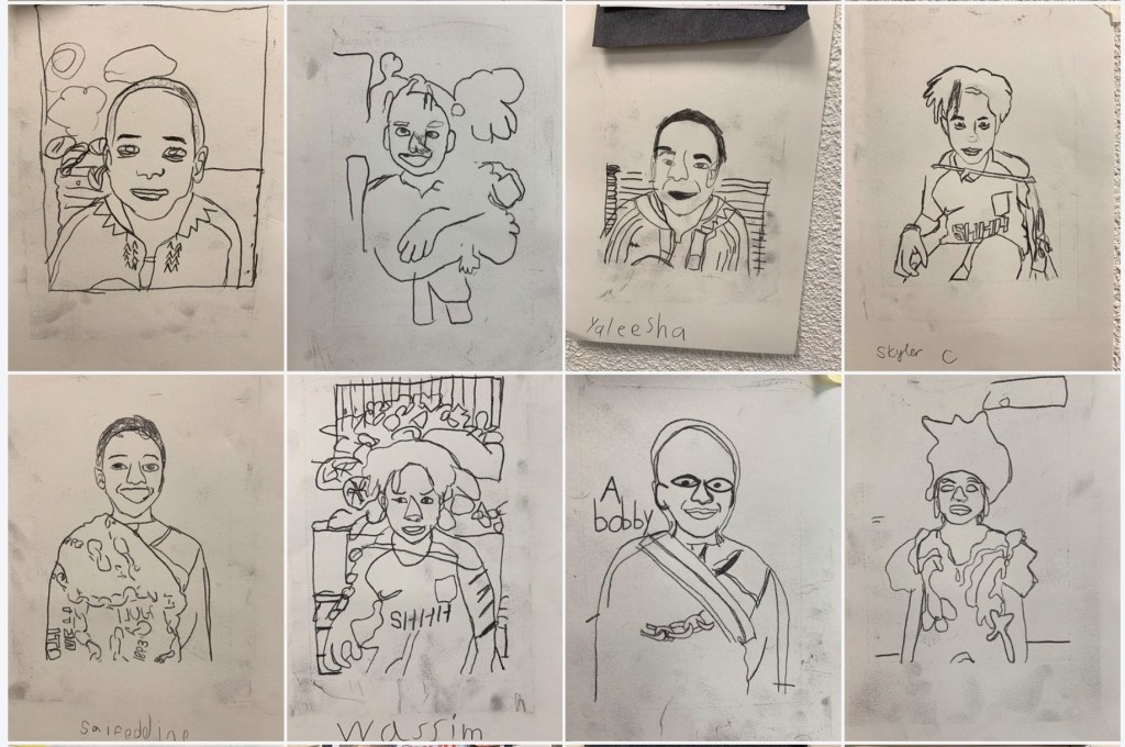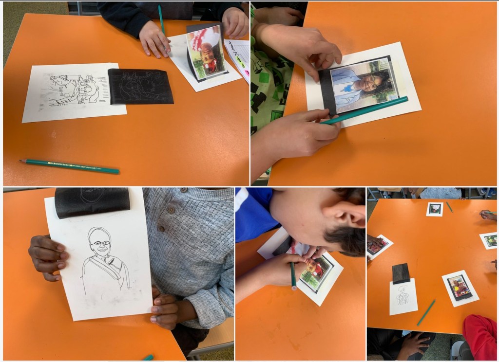 To practice, we printed photos of children from the book ALA SMA TORI – Keti Koti Verbeeld in a small format and glued them to drawing paper with a cut-out piece of carbon paper behind it, so that it wouldn’t shift.