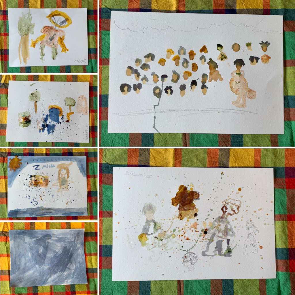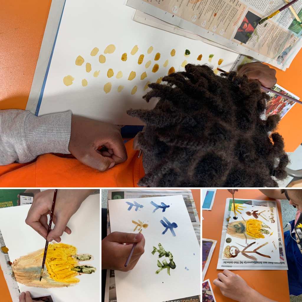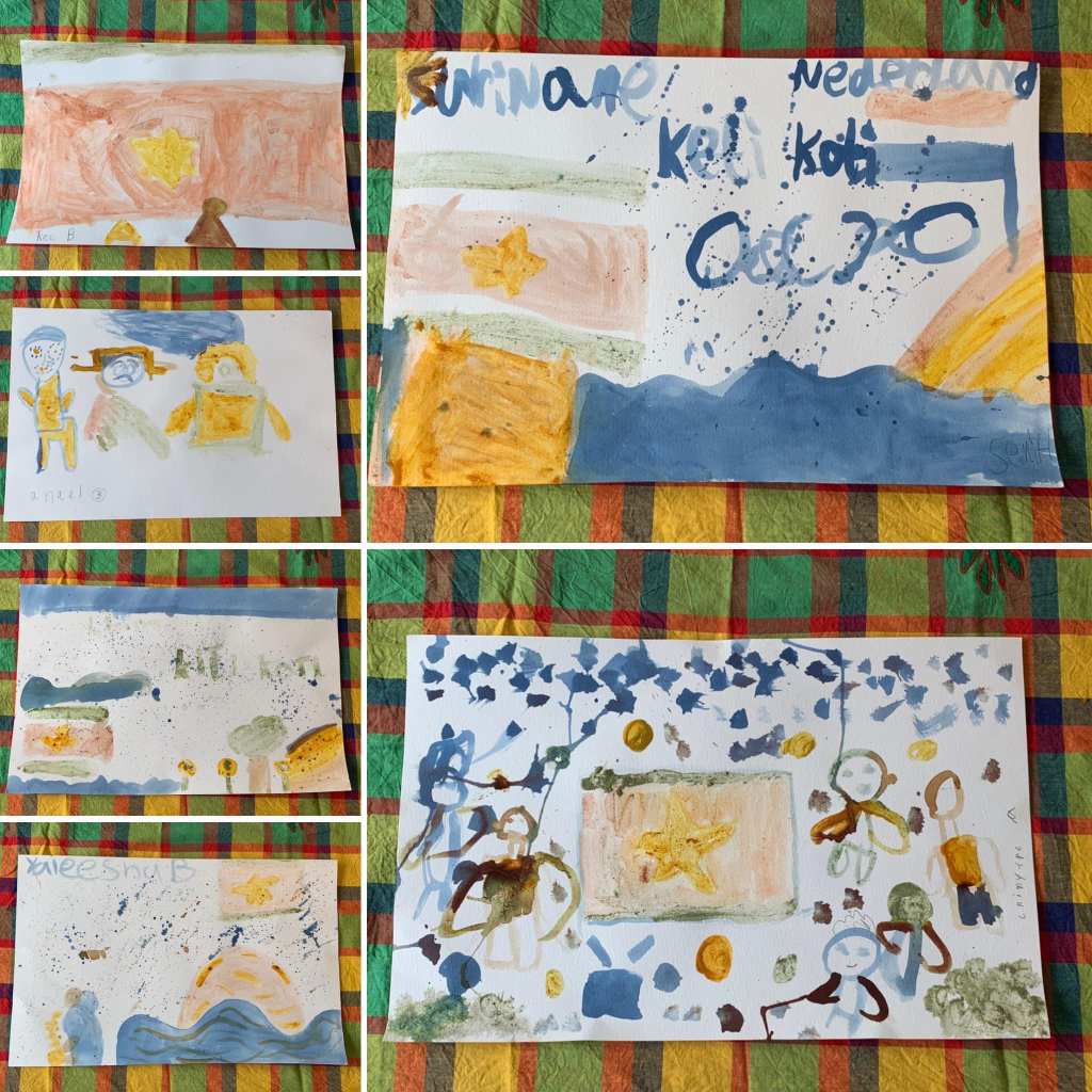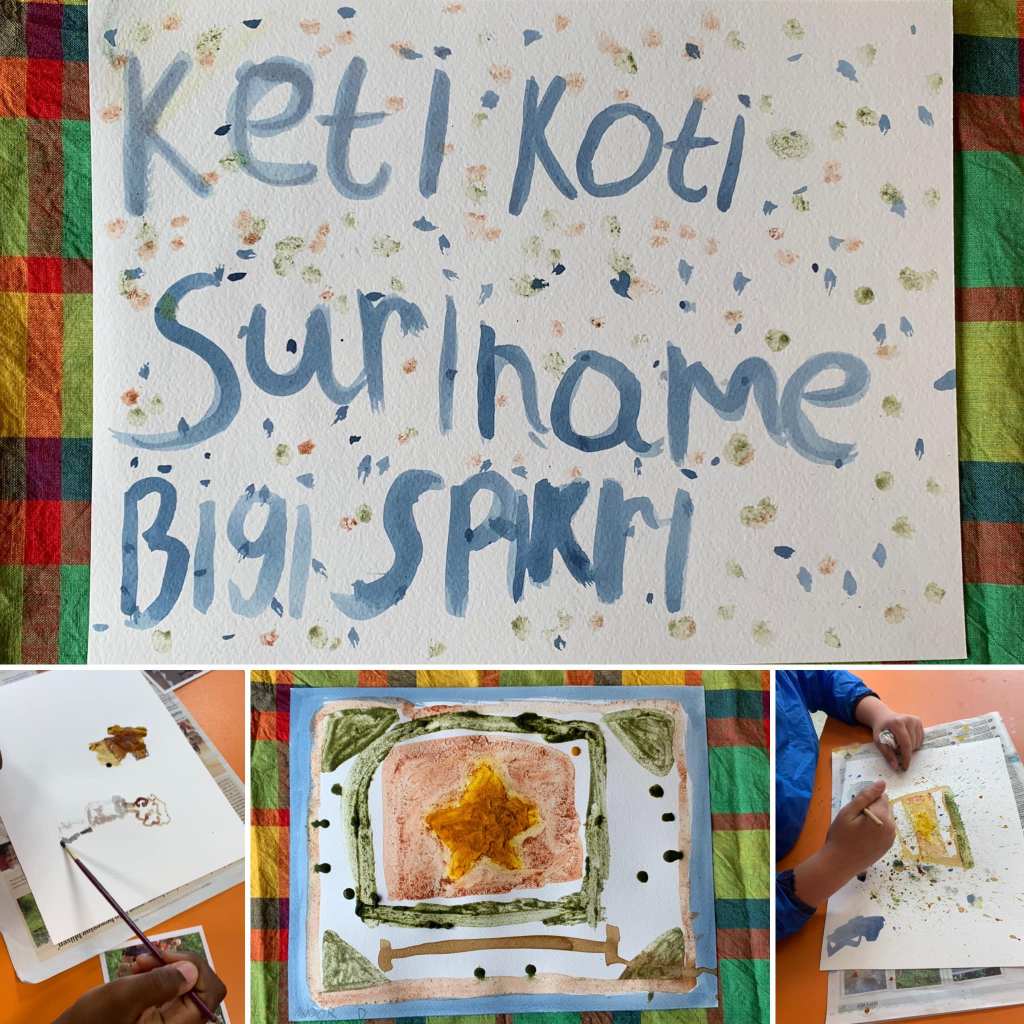 We talked about the history/origin of the raw materials used for the paint, smelled them, mixed them with water. Then we read from ‘Een vrolijke op tocht met Keti Koti’ (A cheerful parade on Keti Koti’) by Henna Goudzand and talked about it with the children.