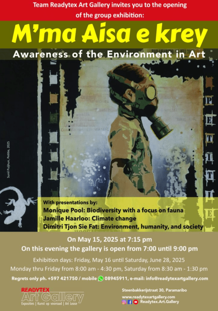 When in Suriname: you are warmly invited to a special evening at Readytex Art Gallery, where art and the environment converge: the opening of the exhibition M’ma Aisa e krey (Mother Earth is Crying) – Awareness of the Environment in Art, from May 15t until June 28.