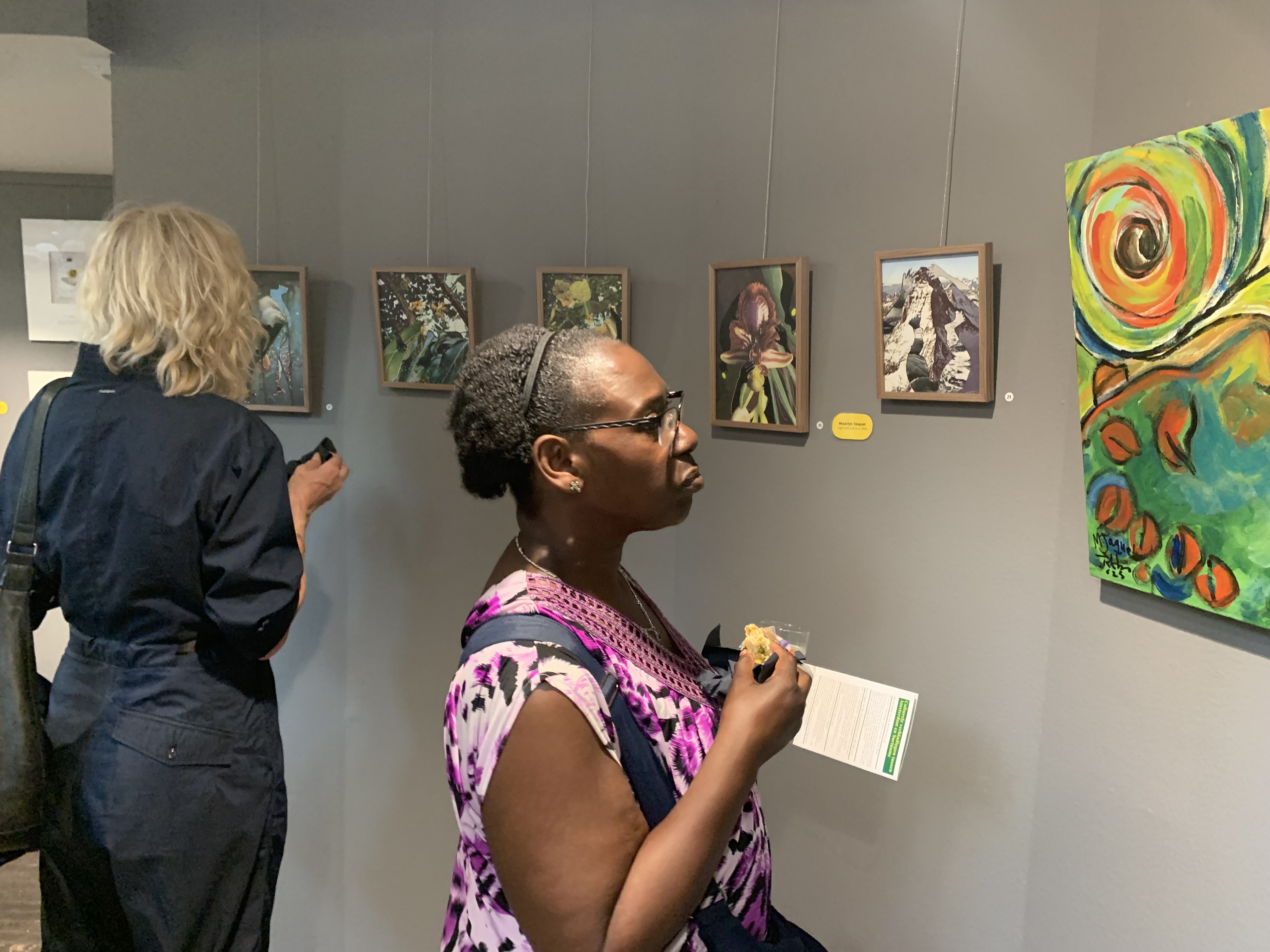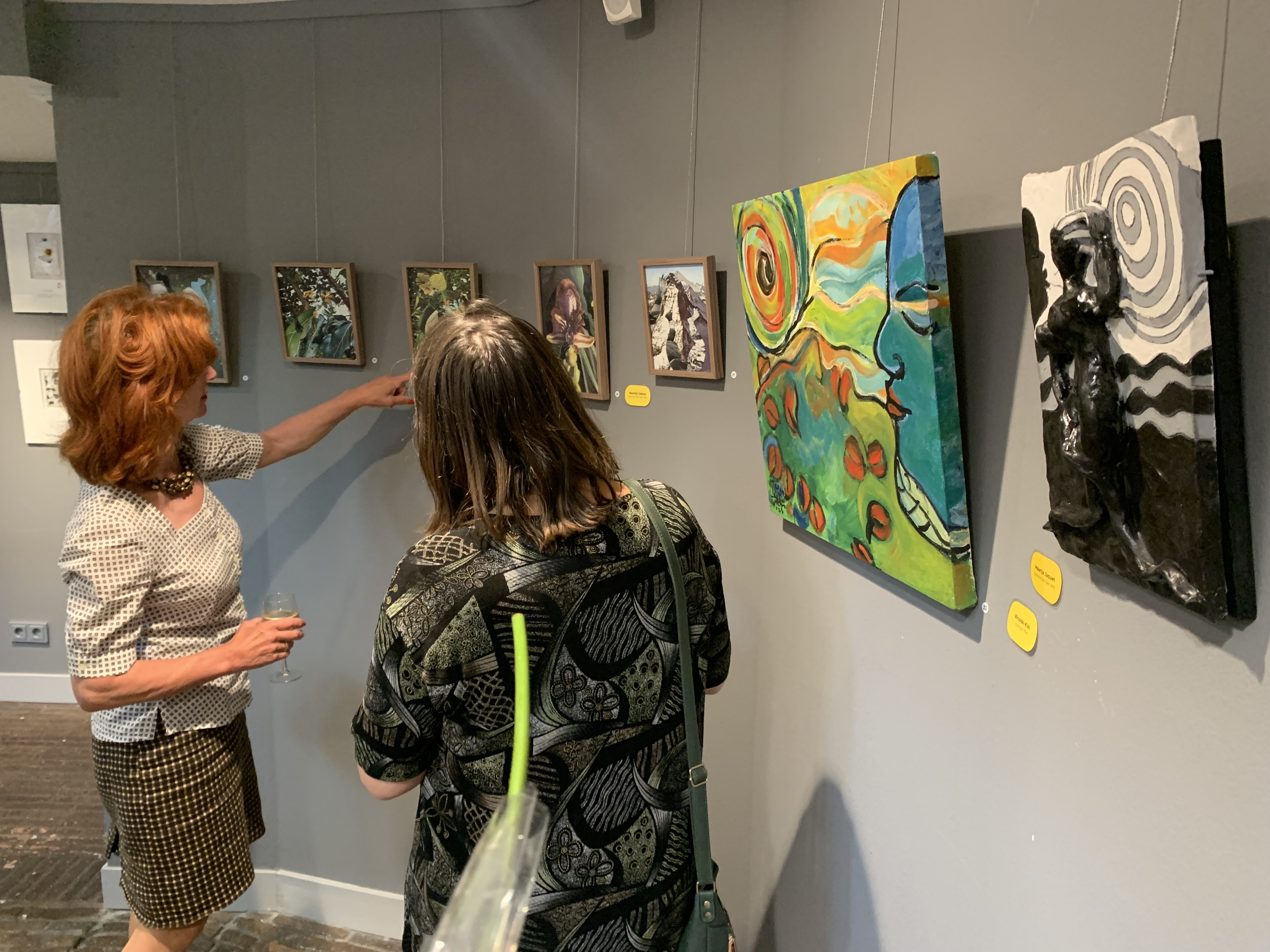 Large turnout yesterday at the opening of the sales exhibition Surinamese Months 2025 in the Amstelkerk, Amsterdam. Curator Myra Winter. The participating artists were allowed to cut the large ribbon ‘Amsterdam 750 years’.