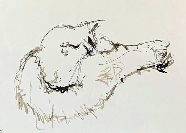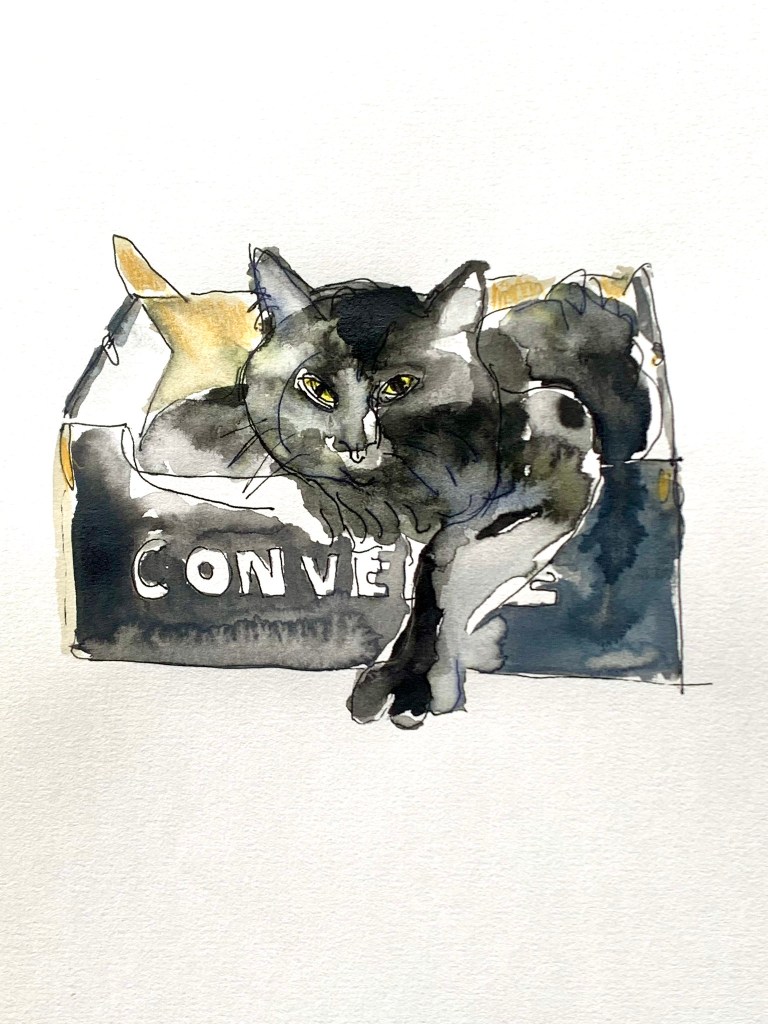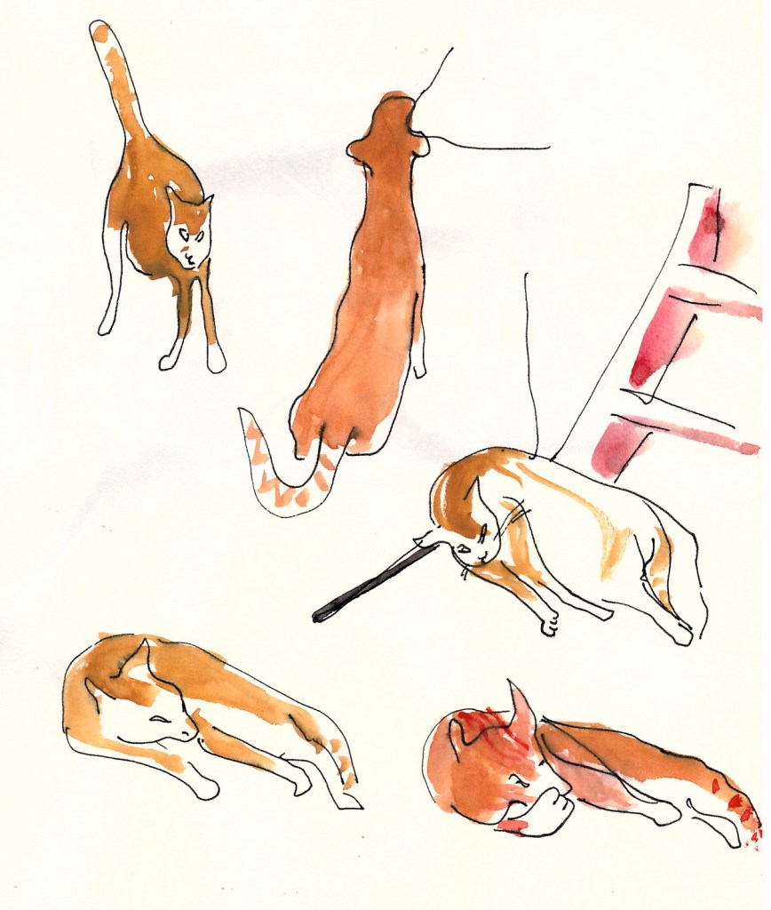 With about fifteen drawings by me in pen (and) watercolor, sometimes pencil, of: Nemo †, Bruggy, Bob †, and Pippi †. Bruggy has been with us since August; Nemo was my friend Krista Peters’ cat. Bob and Pippi were ours.