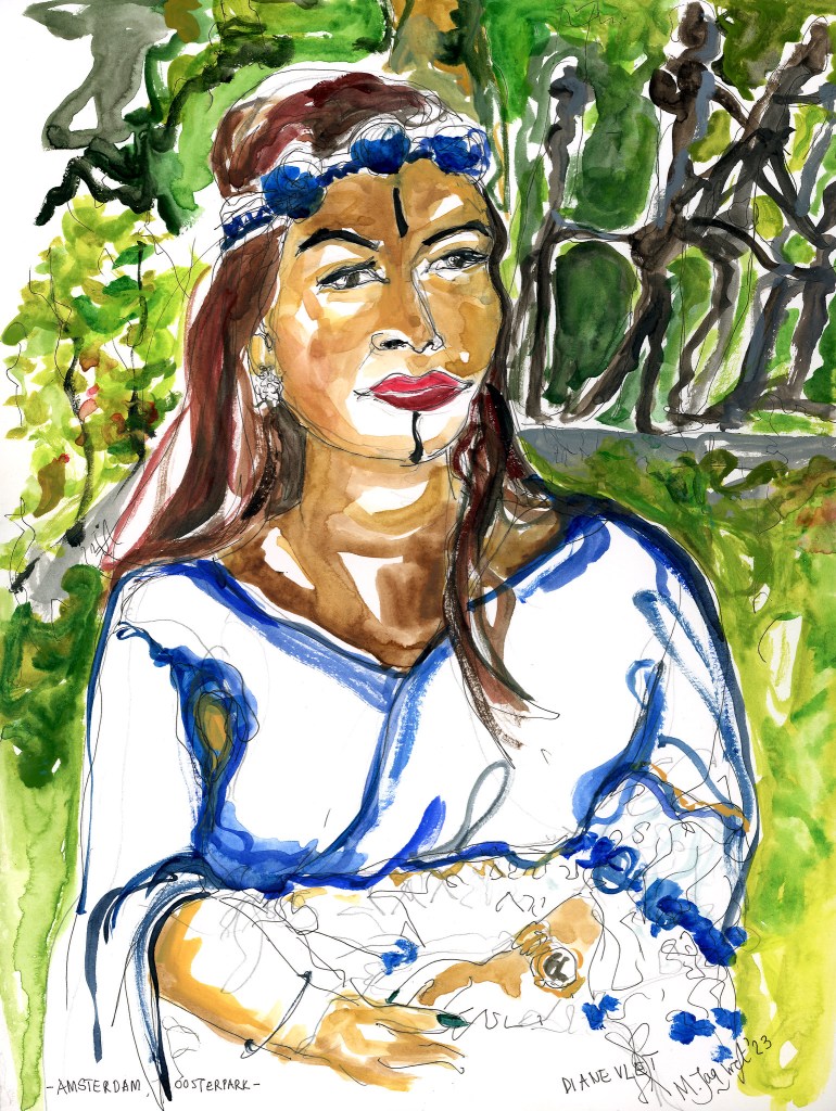 Below: Portrait of Diane Vlet, sitting in front of the Slavery Monument in the Oosterpark, Amsterdam. Pen and watercolor on 29.7 x 42cm paper.
