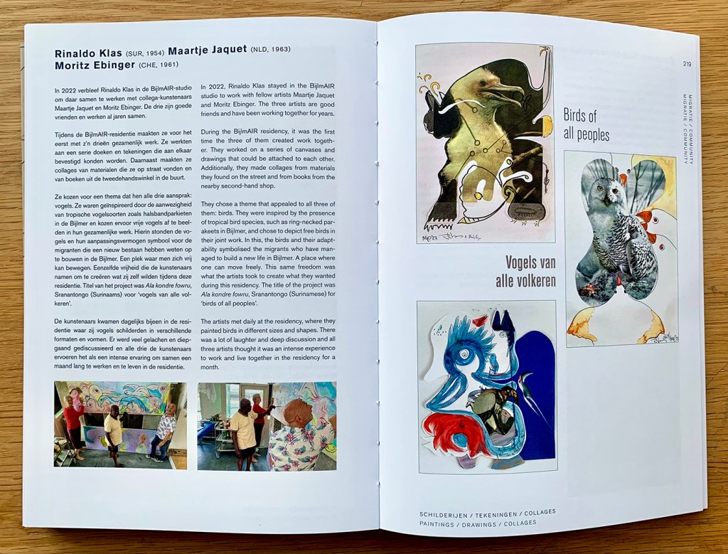 The second artist residency took place in 2022, a group residency: Rinaldo Klas (SUR, 1954) invited Moritz Ebinger (CH, 1961) and me to collaborate. We were inspired by the different bird species in the neighborhood, tropical birds too, like the ring-necked parakeets. We chose depict free birds in our joint work, symbolising the migrants who have managed to build a new life in Bijlmer, a place where one can move freely. In creating our works, we took the same freedom. The title of our project was ‘Ala Kondre Fowru’, Sranan Tongo (Surinamese) for ‘birds of all peoples’. Their was laghter and deep discussion during this intense residency month at BijlmAIR.