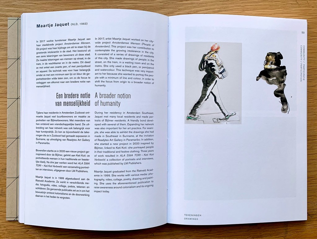 I had the honour to take part in two artist residencies, the first time for four weeks, in May/June 2017. During these weeks I made drawings of people in the neighborhood. Quick drawings with black ink oe with pen/pencil and watercolor, in order to shift the focus from the origin to a broader notion of humanity. The residency resulted in an exhibition, invited by Readytex Art Gallery in Paramaribo, Suriname. Another impact of the residency was the project that started in Amsterdam Southeast where I portrayed people – in pen and watercolor – on the first of July, Keti Koti, when people were commemorating and celebrating the abolishment of slavery by the Dutch in Suriname and the Carribean islands in 1873, in their traditional and festive clothing. The project took three years and resulted in the book Ala Sma Tori – Keti Koti Verbeeld, a collection of portraits and interviews, published by LM Publishers, and also for sale at CBK Zuidoost, on location and in their webshop.